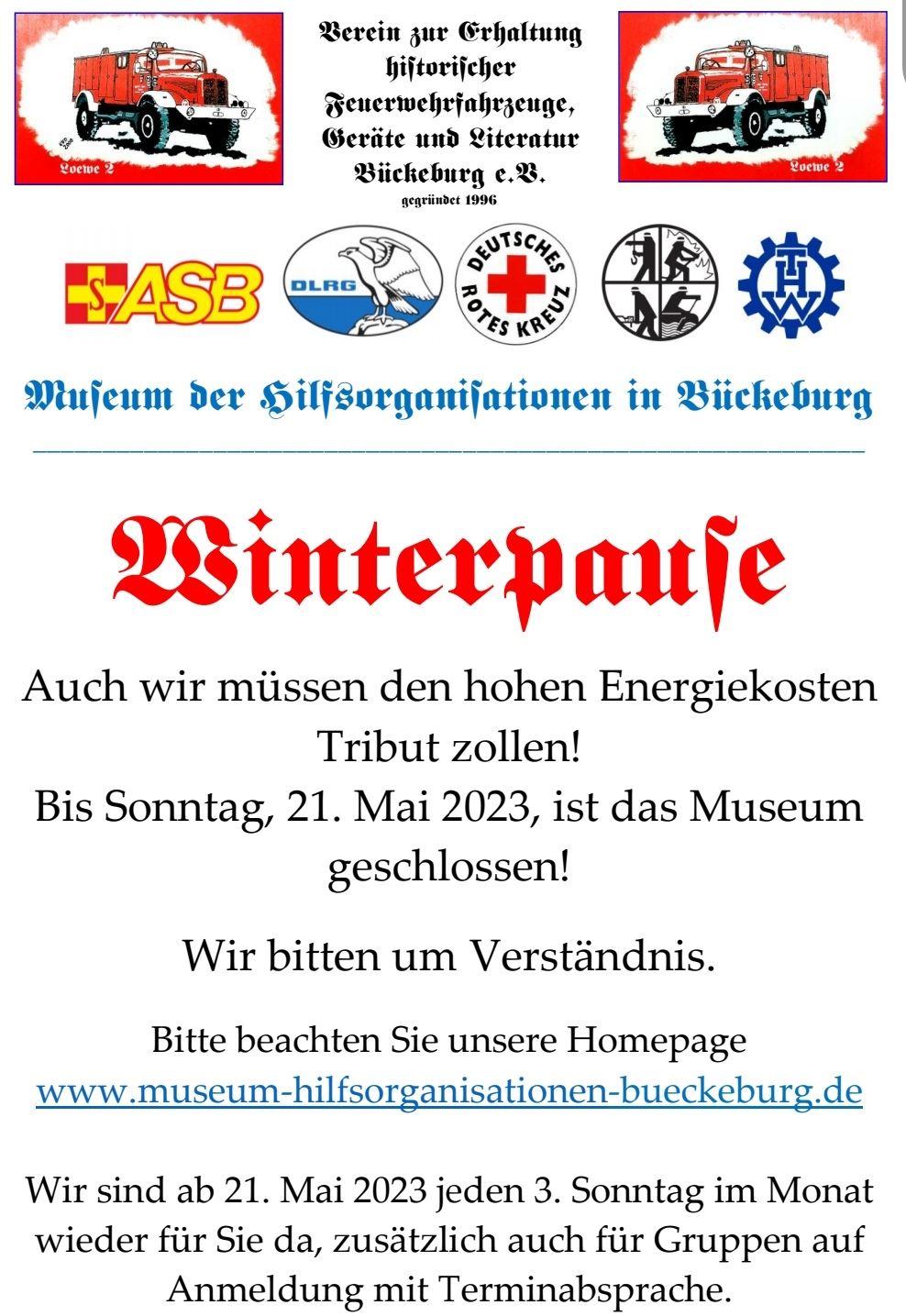 Die Museumsräume werden im Winter teilweise verändert und es sind Arbeiten zur Instandhaltung zu verrichten. Während der Winterpause werden die Räume nur minimal geheizt. Trotzdem beachten Sie den nachfolgenden Hinweis: