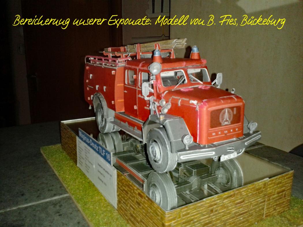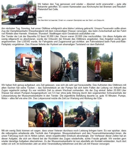 Diese Bearbeitung des Tanks ist eine Spende der Fa. rsp, einem Fachbetrieb nach § 19 WHG für Versiegelungen und Beschichtungen. Dadurch wird ermöglicht, den Wassertank wieder zu nutzen, um beispielsweise Vorführungen mit dem Fahrzeug bei entsprechenden Veranstaltungen in das Programm einzufügen. Es ist seit langer Zeit ein Ziel des Vereins, mit zur Epoche der Indienststellung 1957 des Fahrzeugs passender alter Dienstkleidung die alte Technik realistisch und praktisch zu zeigen. Man könnte auch sagen, dass der Veteran quasi wieder ein einsatzfähiges Fahrzeug ist, denn die eingebaute Pumpe hat z.B. im Herbst 2009 beim Füllen eines Dampfloktenders auf dem Bahnhof Bückeburg unter Verwendung eines Hydranten gezeigt, dass sie uneingeschränkt betriebsbereit ist.