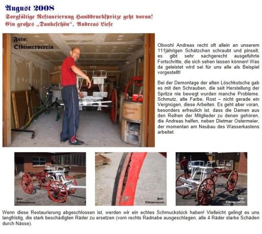 Am zweiten Augustwochenende 2015 konnten wir die allererste Handdruckspritze der Stadt Bückeburg von ca. 1870 zurückholen. Leider ist sie im Lauf der Jahre ziemlich in Mitleidenschaft gezogen worden. Sie ist etwa so alt wie unsere Feuerwehr.